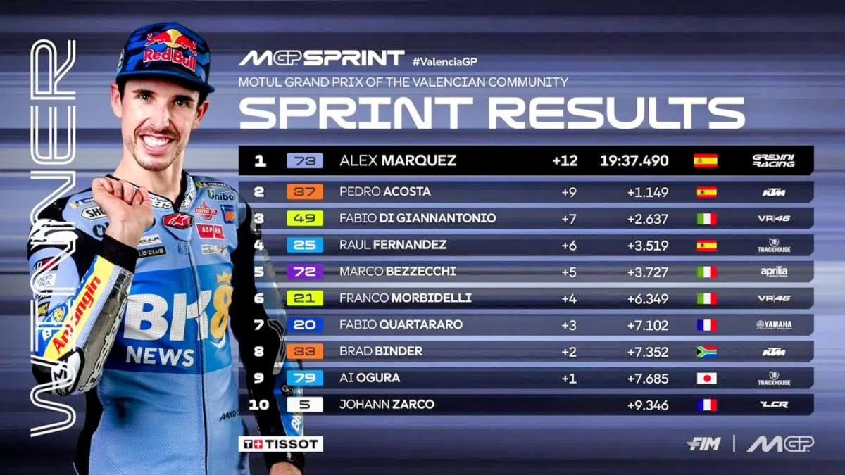 El último Tissot Sprint de la temporada 2025 en el Circuit Ricardo Tormo arrancó con emoción desde la salida. Alex Márquez (BK8 Gresini Racing MotoGP) partió desde la segunda posición y no tardó en tomar el liderato, que ya no soltaría hasta ver la bandera a cuadros en la previa del Gran Premio de la Comunitat Valenciana.