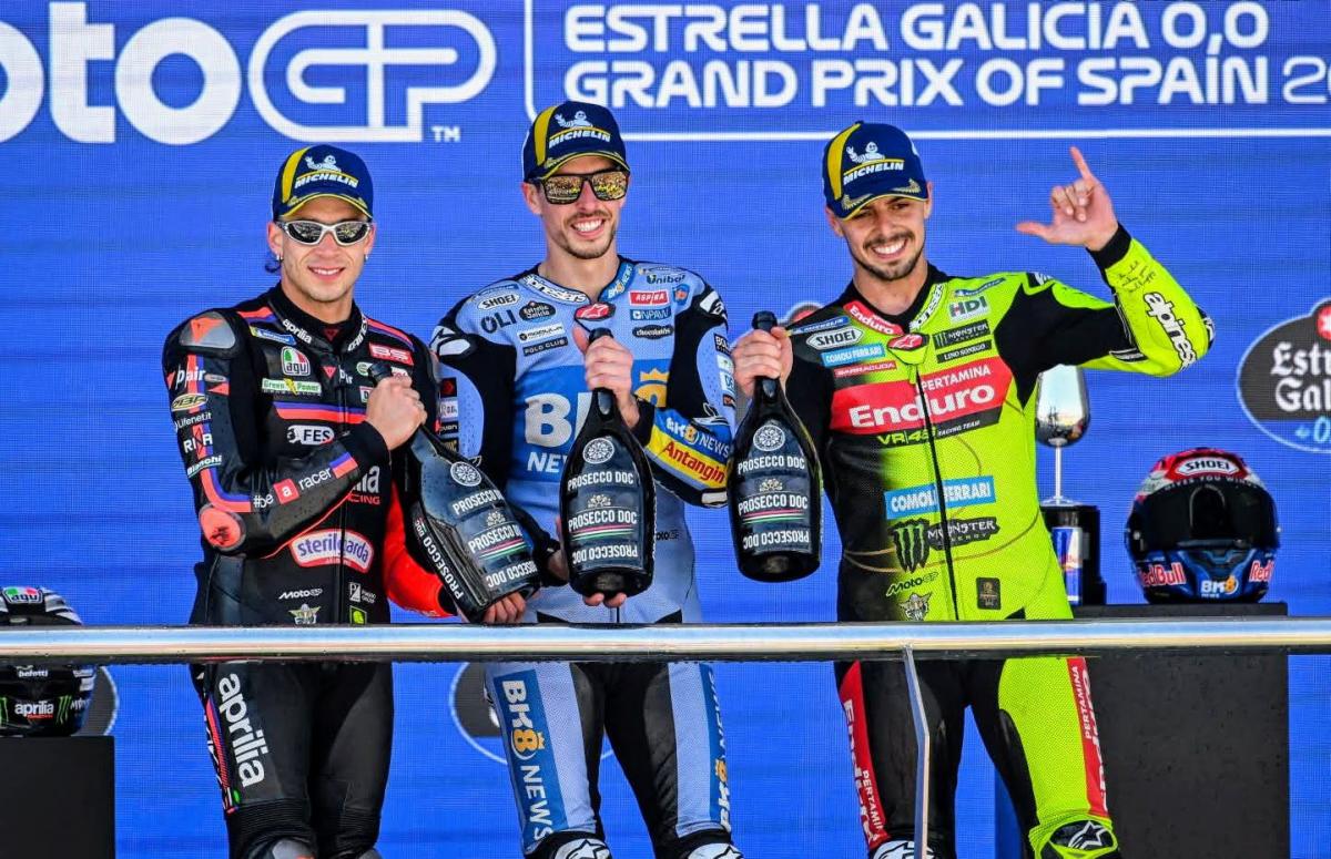 PRENSA MOTOGP. El podio: Marco Bezzecchi (2°), Alex Márquez (1°) y Fabio Di Giannantonio (3°).