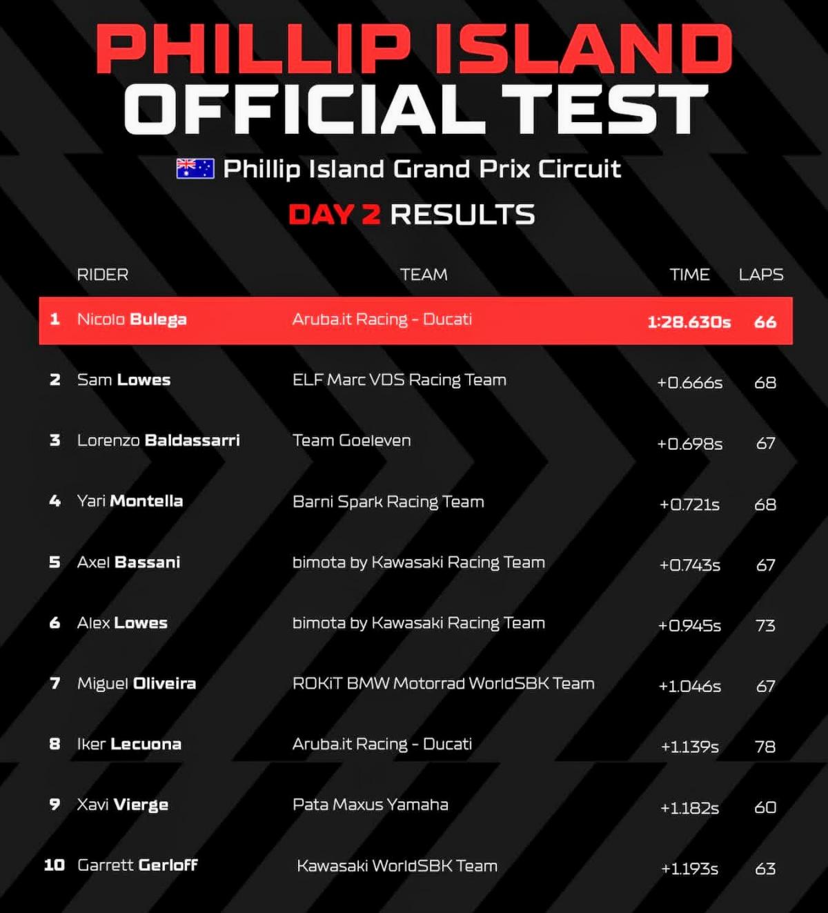 Nicolo Bulega (Aruba.it Racing - Ducati) llega al Round de Australia del próximo fin de semana como favorito tras liderar las cuatro sesiones del Test Oficial en el Circuito de Phillip Island. El #11 ha sido el único en rodar en 1m28s este martes al marcar un 1m28s630 para quedarse con el primer lugar para la parrilla del Campeonato del Mundo MOTUL FIM Superbike.