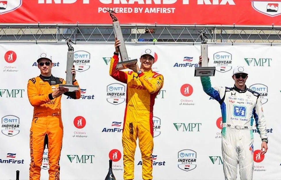 PRENSA INDYCAR. Christian Lndgaard, Alex Palou y Graham Rahal compartiendo el podio.