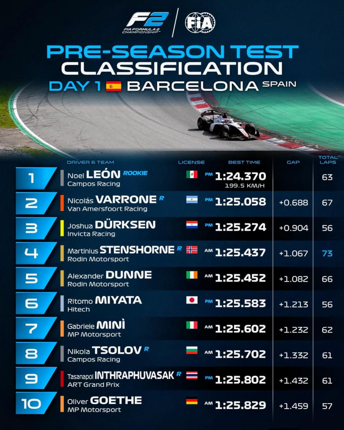 El argentino Nicolás Varrone, del equipo Van Amersfort Racing, empezó con el pie derecho consiguiendo el segundo lugar en la primera jornada de la pretemporada 2026 que la Fórmula 2 Internacional de la FIA puso en marcha este martes en el ''Circuito Cataluña-Barcelona'', que tiene una extensión de 4.567.