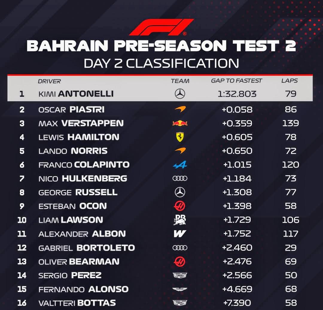 Esta vez, después de que Lando Norris (McLaren) marcara el rumbo en la sesión matutina, Andrea Kimi Antonelli se colocó al frente por la tarde con una vuelta de 1m32s803 que consiguió al entrar en la última hora de actividad. Es el mejor registro en lo que va de la pretemporada en el circuito de Bahréin.
