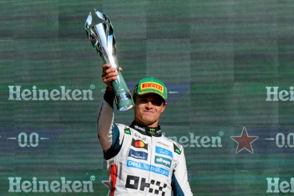 FOTO EL NOTICIERO DIGITAL. El piloto mendocino levanta en el podio la tan ansiada Copa de Oro del TC.