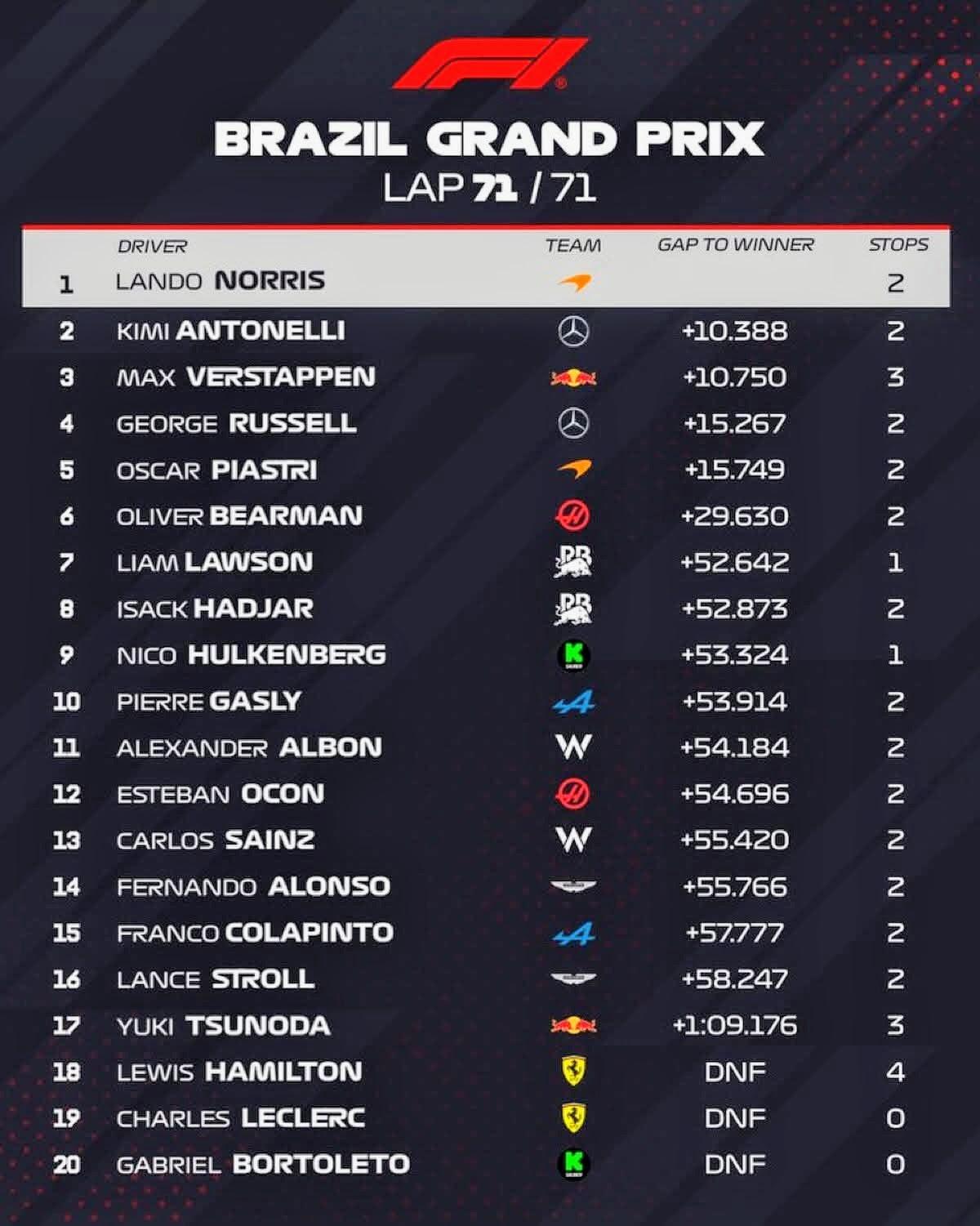 Piastri descendió al séptimo puesto con su sanción, mientras el holandés se colocó cuarto por detrás de los Mercedes. A partir de ahí, Verstappen atacó y a 10 giros de final con el blando superó a Russell para después lanzarse al ataque de Antonelli a quien alcanzó en los último cuatro giros sin lograr su cometido.