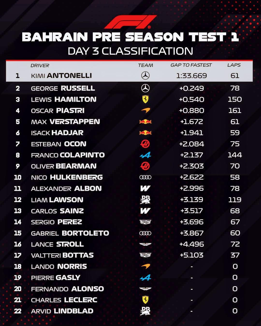 Oscar Piastri fue cuarto en el clasificador final, pero fue el piloto que más giró, con 161 vueltas en el McLaren MCL40. Max Verstappen e Isack Hadjar terminaron el día en la quinta y sexta posición respectivamente para Red Bull, con 120 vueltas entre los dos, seguidos de Esteban Ocon, que se combinó para un total de 145 con Oliver Bearman en Haas.