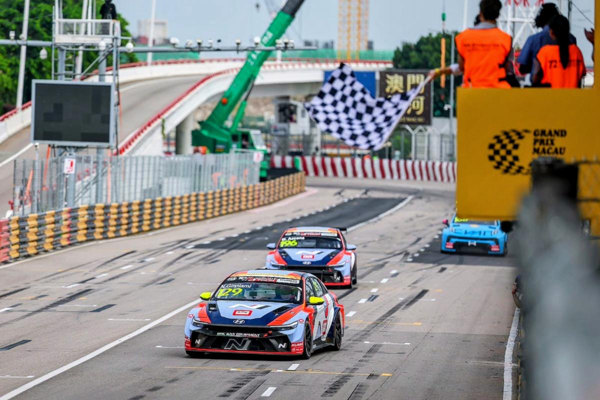 PRENSA TCR WORLD TOUR. Néstor Girolami recibe la bandera a cuadros al ganar la Carrera 1 en Macao.