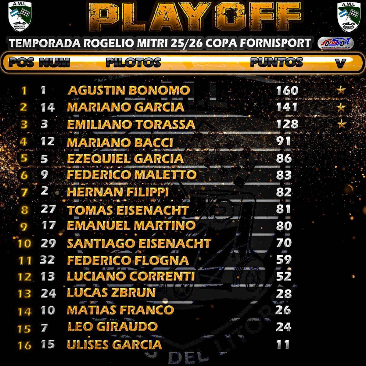 Con dos carreras para que finalice el play off, el vigente campeón Agustín Bonomo, encabeza las posiciones y tiene muy buenas chances de revalidar el título, habida cuenta de la buena diferencia que acumuló en la actual temporada, pero hay otros postulantes a la corona, toda vez que el “Premio Coronación”, que marcará el cierre de la actividad, otorgará puntaje y medio.