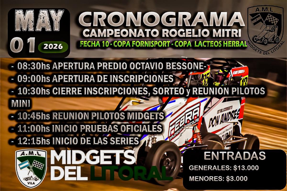 Este viernes 1° de mayo, el Midgets del Litoral disputará la penúltima fecha del Torneo Oficial “Rogelio Mitri” - “Copa ForniSpot” en el circuito permanente “Juan F. B. Basso” de la localidad de Vila.