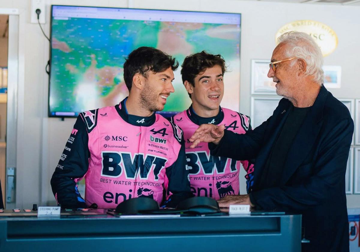 PRENSA ALPINE. Los pilotos Pierre Gasly y Franco Colapinto con el jefe del equipo Flavio Briatore.