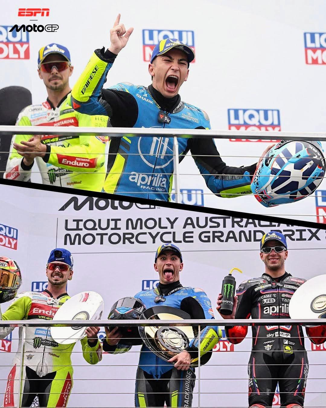 PRENSA MOTOGP. El ganador (arriba) y el podio con Di Giannantonio, Fernández y Bezzecchi.