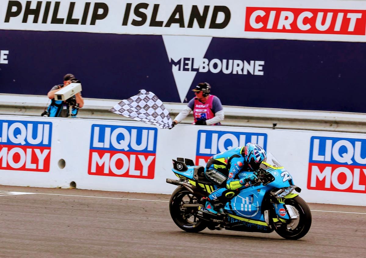 PRENSA MOTOGP. Raúl Fernández recibe la bandera a cuadros tras lograr su primera victoria en Phillip Island.