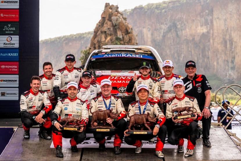 PRENSA WRC.COM. El festejo del primero y el tercer lugar del Toyota Gazoo Racing en Kenia.