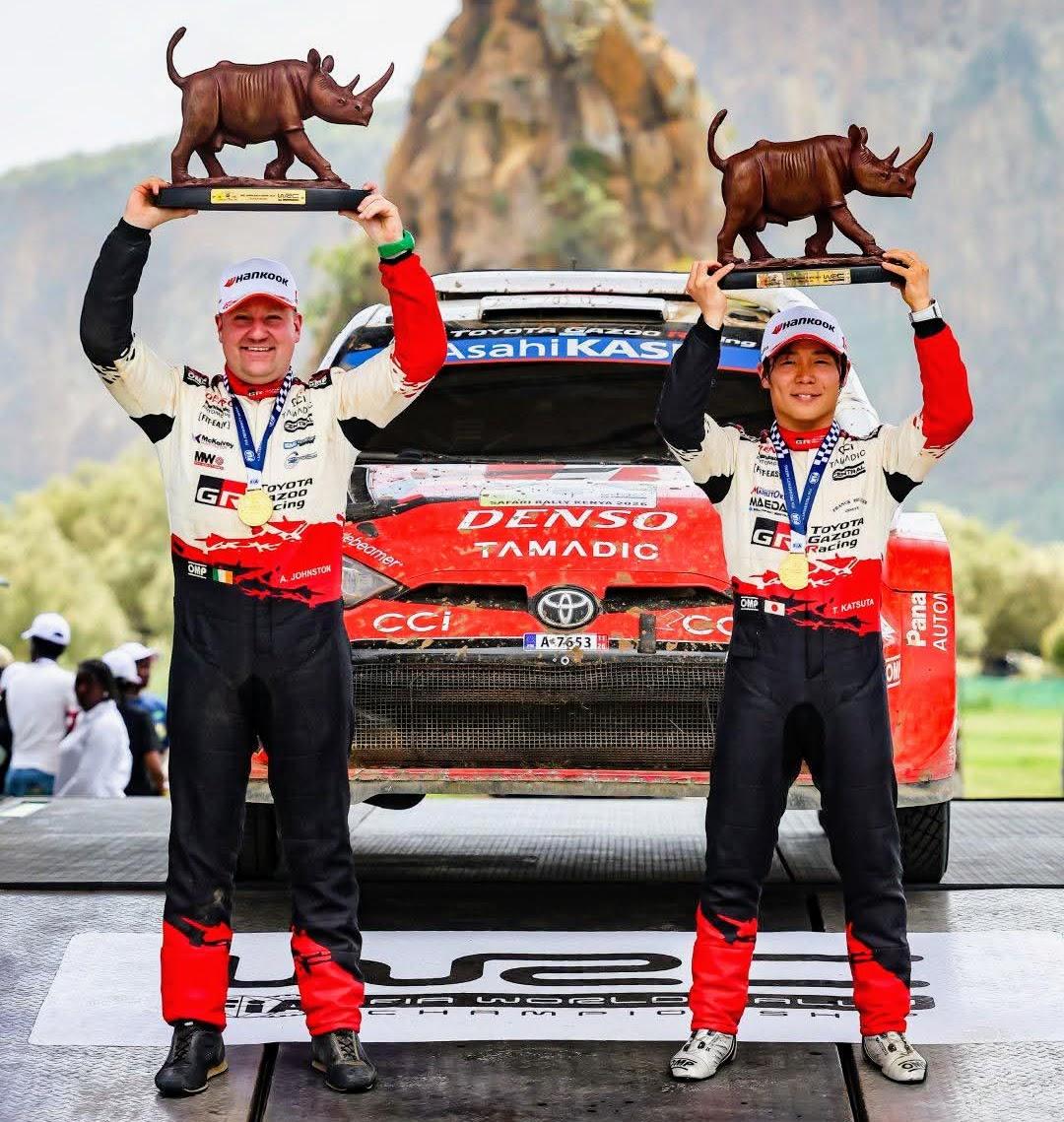 PRENSA WRC.COM. Takamoto Katsuta y su navegante Aaron Johnston con los icónicos trofeos del Rally Safari.