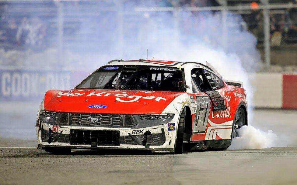 PRENSA NASCAR CUP SERIES. Ryan Preece quemando neumáticos luego de su triunfo en Carolina del Norte.