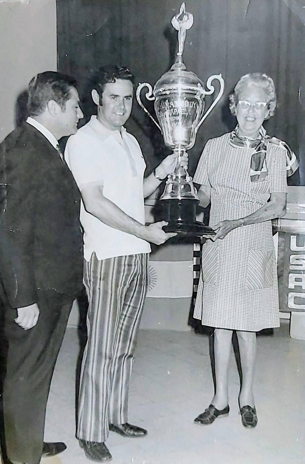 FOTO ARCHIVO. Eduardo Ricotti en la entrega de la copa a Al Unser, junto a su madre Mary.
